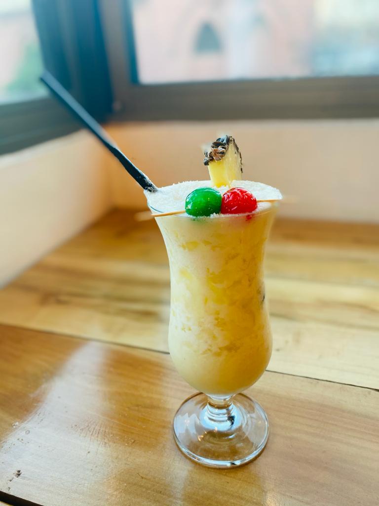 RON BLANCO, TROZOS DE PIÑA, JUGO DE PIÑA, CONCENTRADO DE COCO, CREMA DE LECHE, MALIBU (LICOR DE COCO), HIELO FRAPPE Y COCO RALLADO